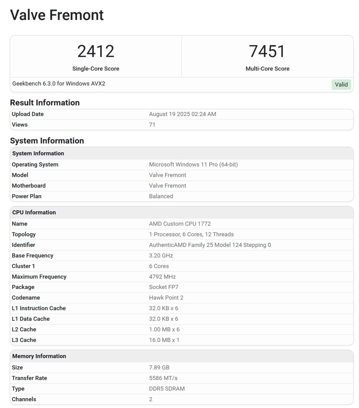 Согласно результатам бенчмарка, Valve Fremont работает на 6-ядерном кастомном процессоре AMD. Как пишет VideoCardz, речь может идти о мобильном чипе Hawk Point с ядрами Zen 4.