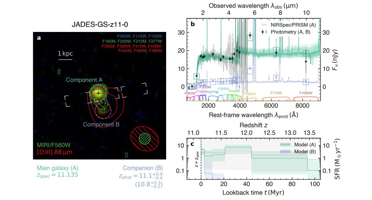 Благодаря телескопу «Джеймс Уэбб» международная группа исследователей обнаружила галактику JADES-GS-z11-0, существовавшую всего через 400 миллионов лет после Большого взрыва. Несмотря на возраст, галактика оказалась богата кислородом.