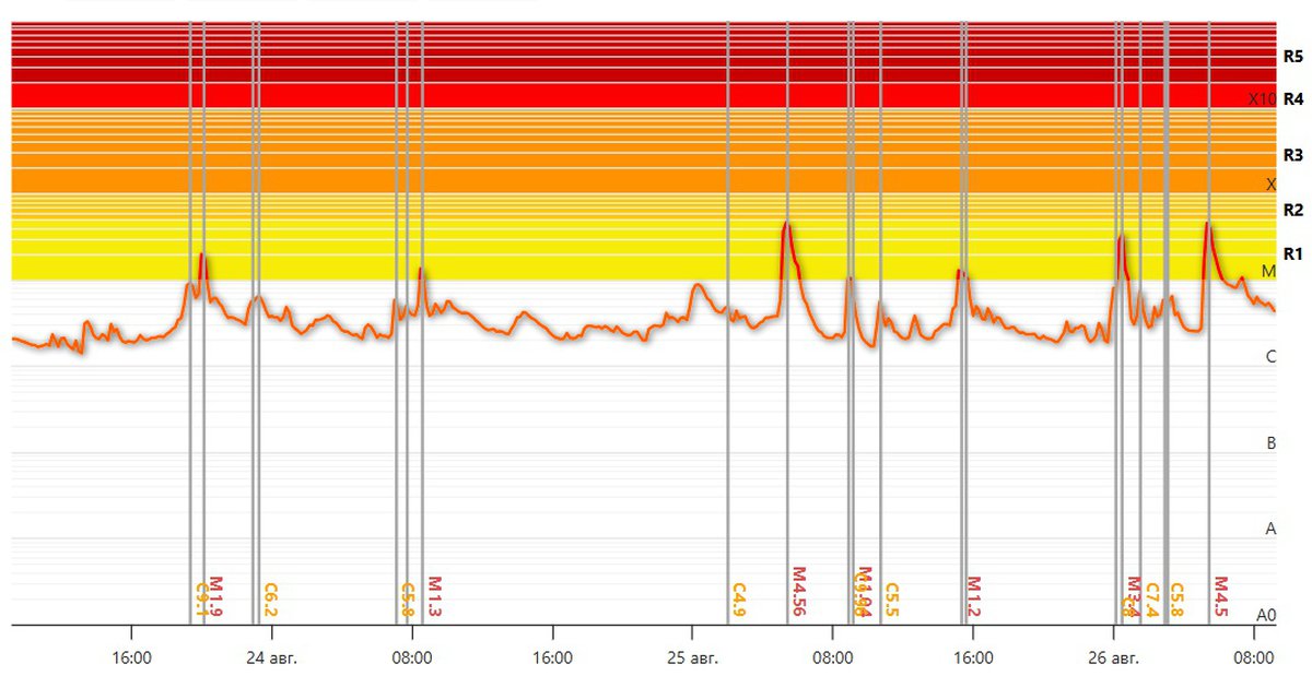 Кроме того, 25 августа в атмосфере Земли был зафиксирован протонный шторм: поток заряженных частиц, выброшенных Солнцем. Хотя он отнесен к слабой категории S1 и не представляет угрозы для здоровья людей и космических полетов, специалисты отмечают, что подобные явления свидетельствуют о росте солнечной активности.
