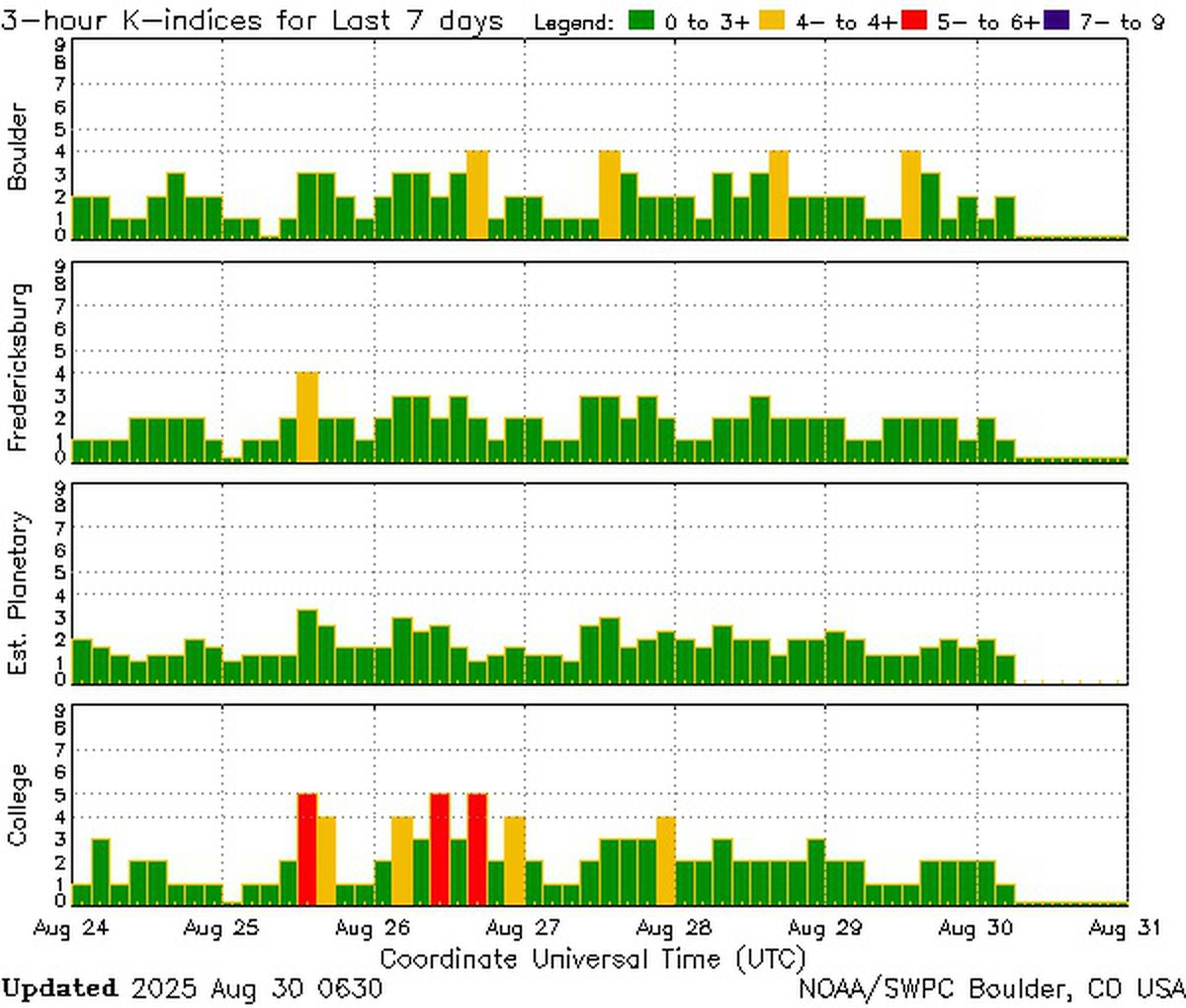 Геомагнитная обстановка 31 августа обещает быть умеренно спокойной, считают аналитики британского Met Office и NOAA США. Ожидается, что индекс геомагнитной активности Kp останется в пределах 2-2.67 балла.