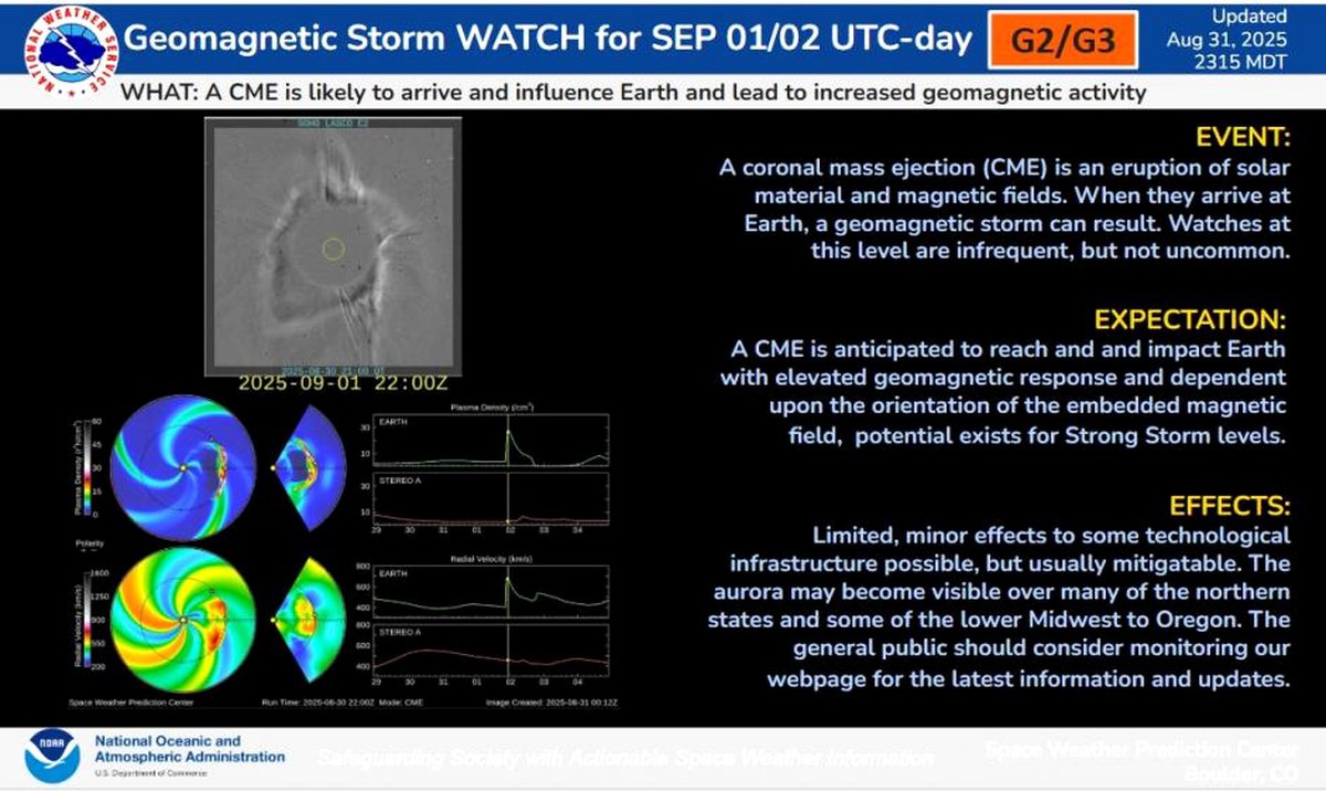 Согласно предварительным прогнозам, геомагнитная буря 1 сентября начнется ближе к вечеру. Точно прогнозировать время начала таких событий нелегко, есть вероятность, что магнитная буря начнется в ночь с 1 на 2 сентября.