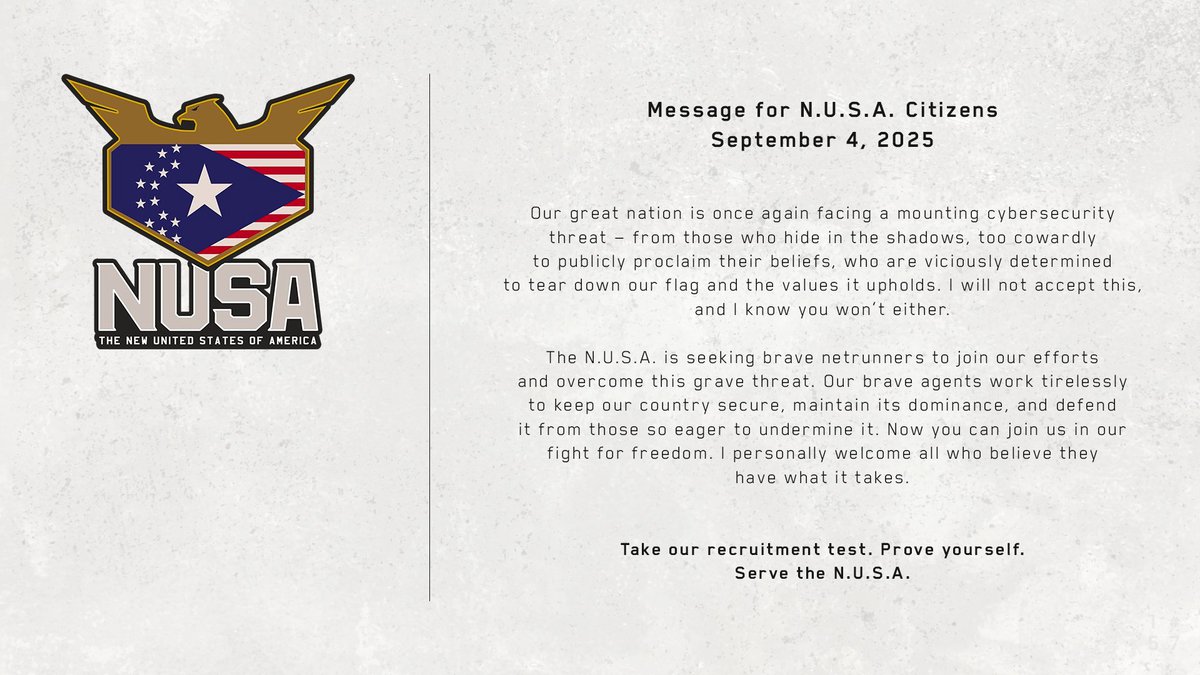 В тексте говорится, что великой нации грозят некие проблемы в киберпространстве и стране требуются «смелые нетраннеры, готовые помочь справиться с этой опасностью».