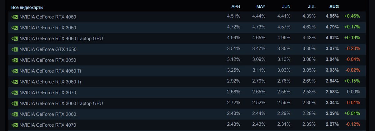 Видеокарты GeForce RTX 3060, RTX 4060 и мобильная версия RTX 4060 на протяжении 2025 года поочередно занимали первую строчку чарта Steam. В июле лидировала RTX 3060, но в августе ее сместила RTX 4060, прибавившая 0.46% и показавшая лучший прирост за месяц.