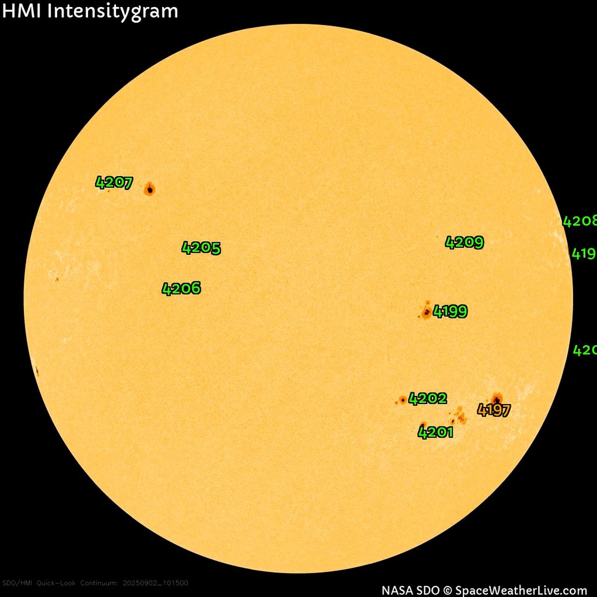Хотя магнитная буря 3 сентября пока не ожидается, Солнце продолжает показывать высокий уровень активности. На видимом диске есть около десяти активных областей, крупнейшей остается нестабильное пятно AR4197.