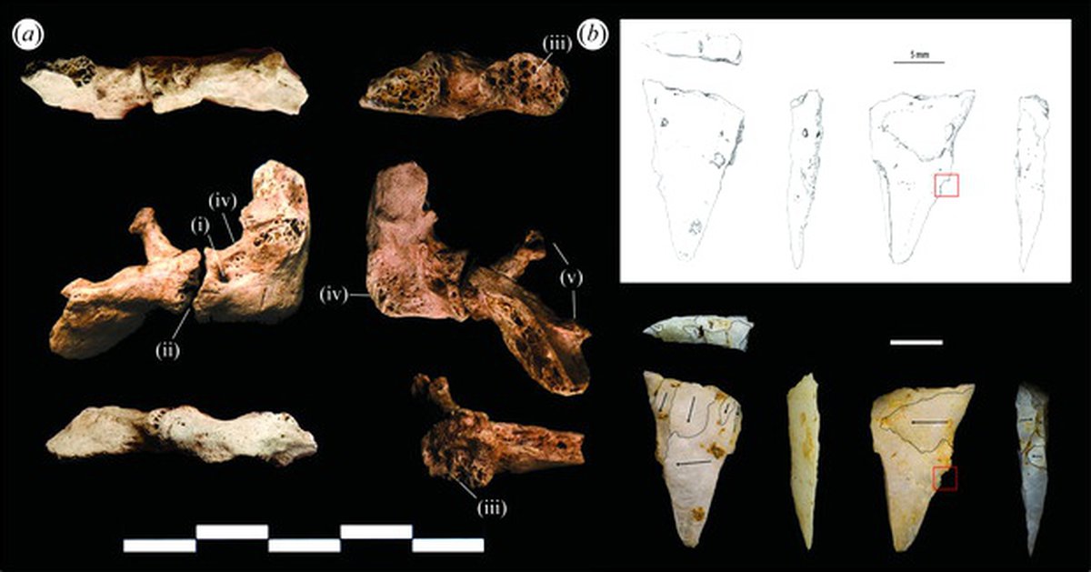 Рядом с поврежденным ребром был найден фрагмент кварца длиной менее 2 сантиметров. По насечкам ученые определили: кварц был частью наконечника стрелы или дротика.