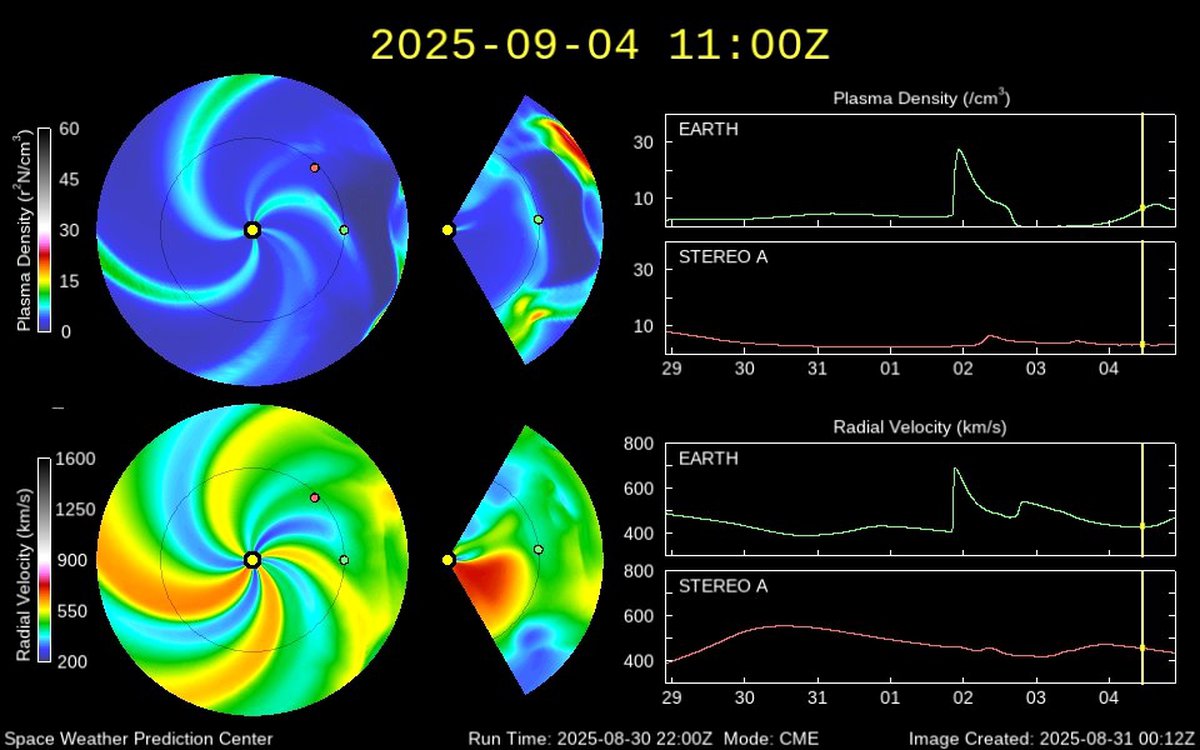 Если верить модели распространения солнечного ветра WSA-Enlil, 4 сентября Земля пройдет через очень небольшой поток более плотной плазмы — видимо, именно он повлияет на нашу магнитосферу. Вход в поток быстрой плазмы ожидается не раньше вечера.