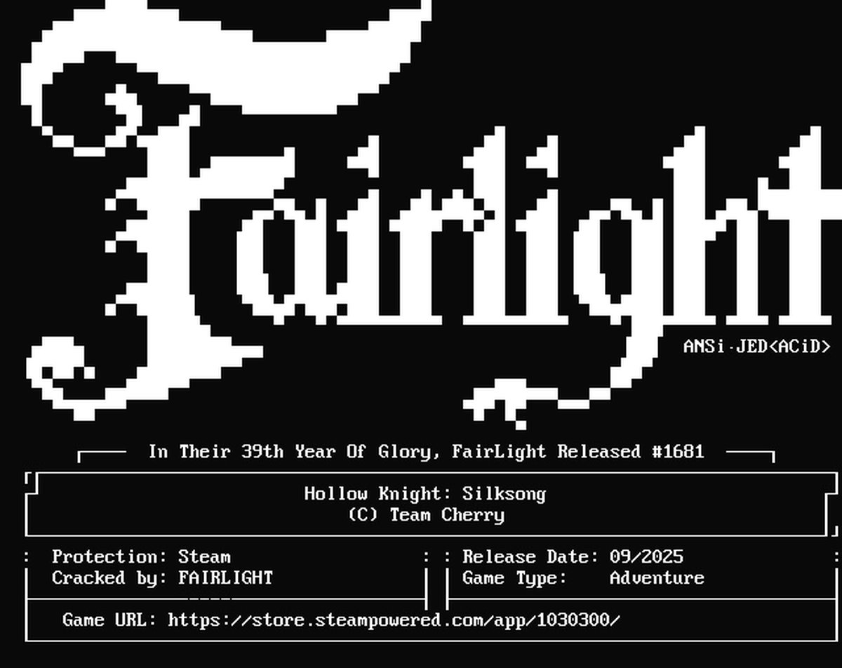 Как и ожидалось, версия Hollow Knight Silksong была защищена только DRM-системами магазинов, где она была выпущена. Группа Fairlight обошла защиту Steam с помощью эмулятора и выложила Hollow Knight Silksong в открытый доступ.