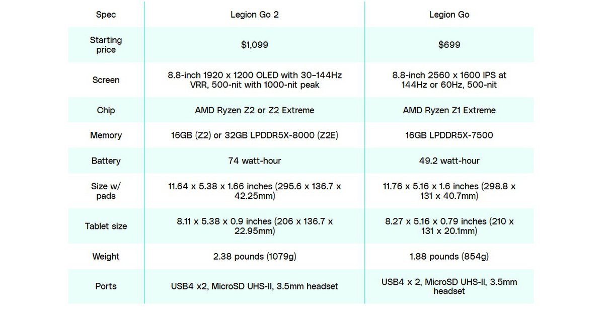 Legion Go 2 получила чип Ryzen Z2 (или Z2 Extreme у топовой версии) и 16–32 гигабайта памяти LPDDR5X-8000. У консоли OLED-экран с разрешением 1200p, накопитель на 1-2 терабайта и батарея на 74 Вт-ч.