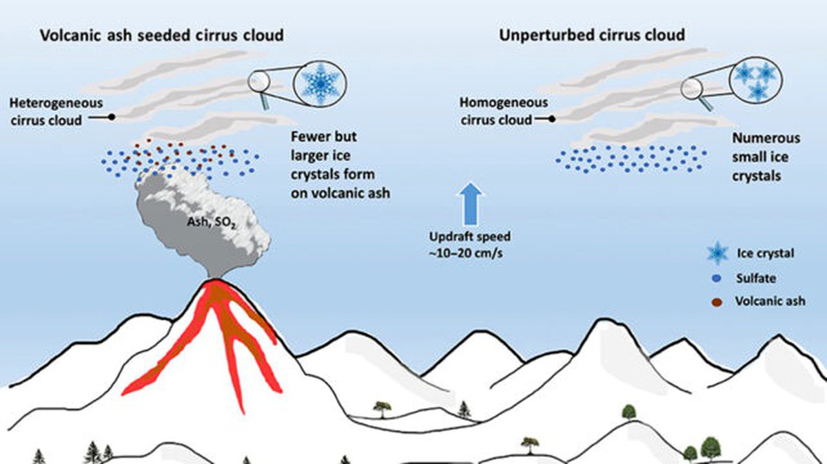 Извержения выбрасывают в атмосферу не только газы вроде углекислого и сернистого, но и огромное количество пепла. Оказалось, что на высоте более 10 километров частицы пепла становятся центрами, вокруг которых формируются ледяные кристаллы перистых облаков.