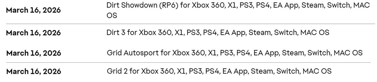 Electronic Arts обновила расписание отключения серверов старых игр. В расписании появились четыре гоночных проекта от Codemasters: DiRT 3, GRID 2, DiRT Showdown и GRID Autosport.