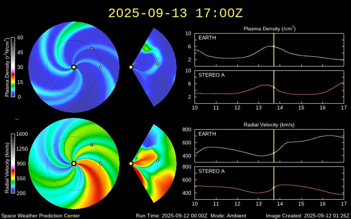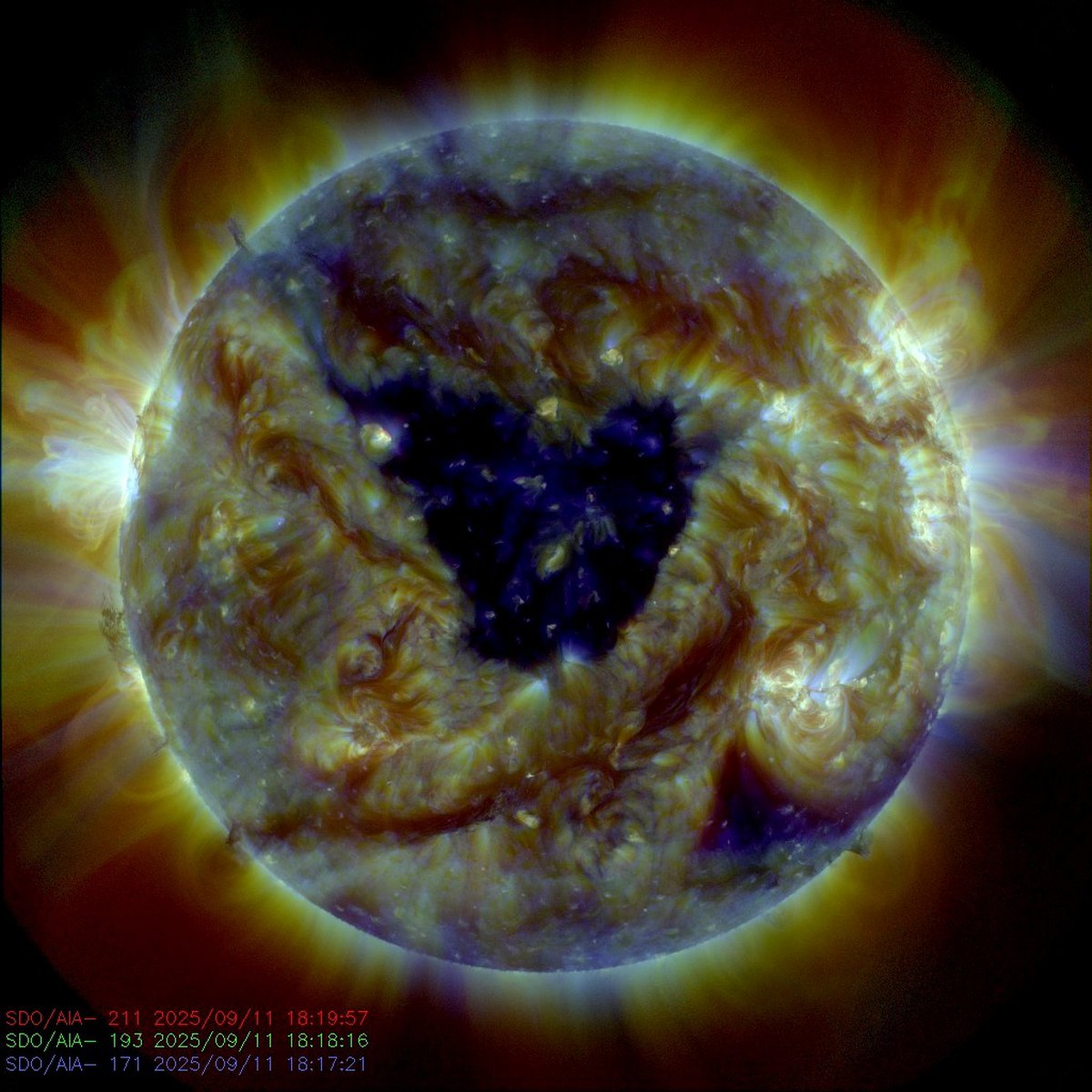 По оценке британских аналитиков, поток частиц из крупной транcэкваториальная корональная дыра может достичь Земли уже вечером 13 сентября. Вероятно, встреча Земли с потоком солнечного ветра будет сопровождаться магнитной бурей класса G1.