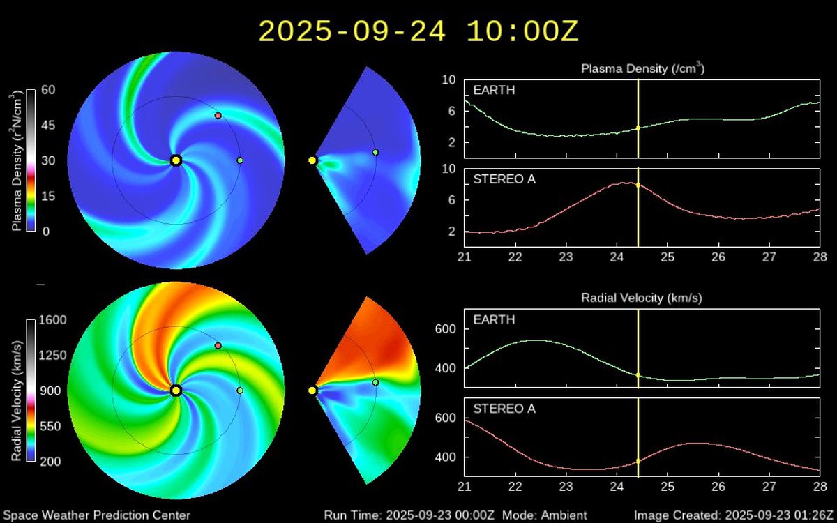 Ожидается, что 25 сентября геомагнитная обстановка будет еще спокойнее. Корональных выбросов массы и новых корональных дыр на горизонте нет, если не случится ничего неожиданного, то до выходных магнитных бурь точно не будет.