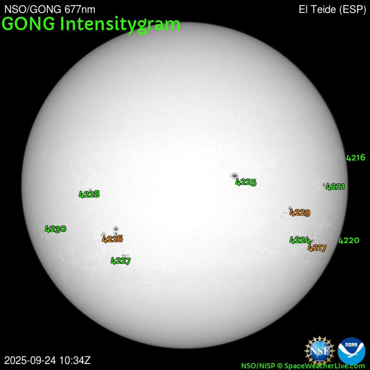 Кроме того, Солнце продолжает демонстрировать низкий уровень вспышечной активности. 23 сентября была зарегистрирована вспышка класса M1.0 из пятна AR4217, но она не сопровождалась корональным выбросом массы в сторону Земли.