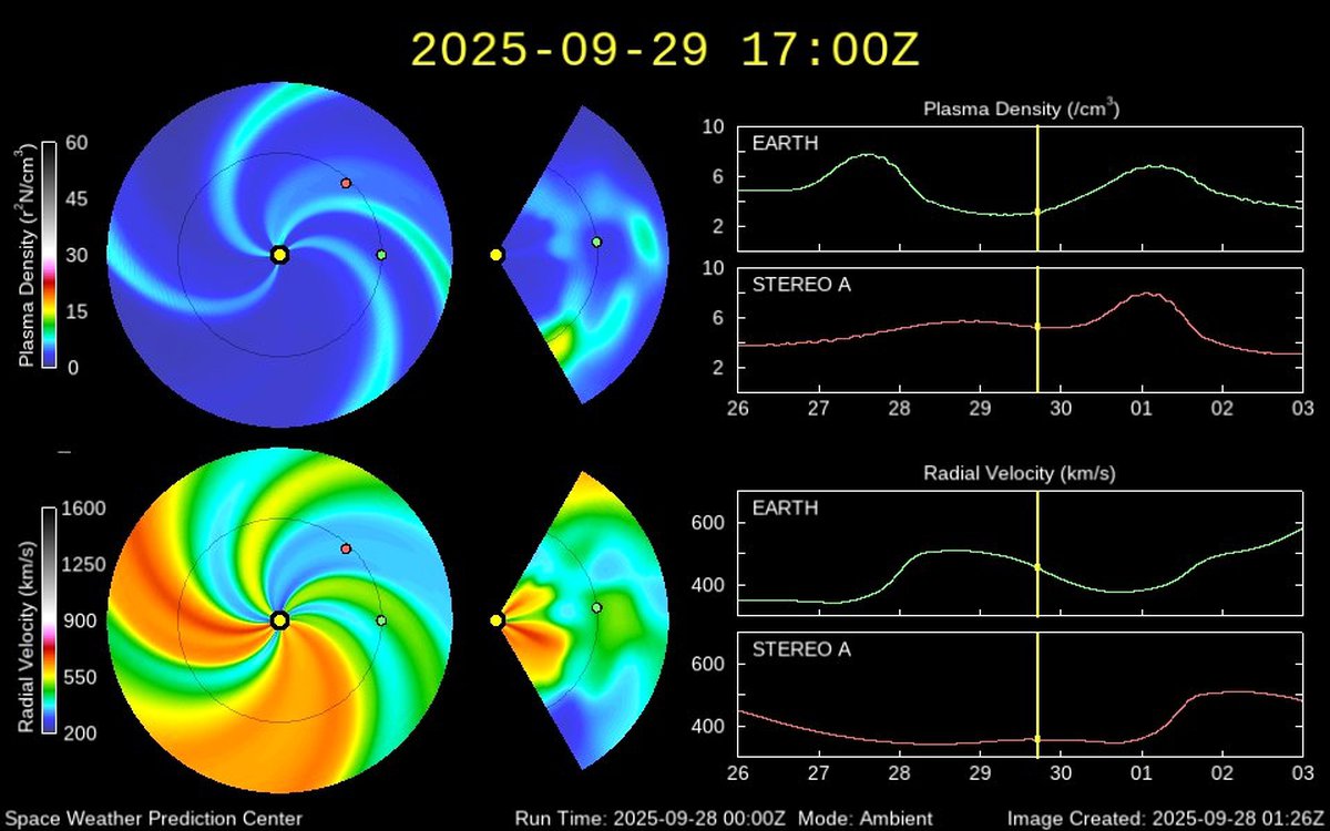 Согласно предварительным прогнозам, вероятность магнитной бури минимального класса G1 29 сентября оценивается на уровне 15%. Этому способствует как слабость потока солнечного ветра, так и отсутствие корональных выбросов в сторону Земли.