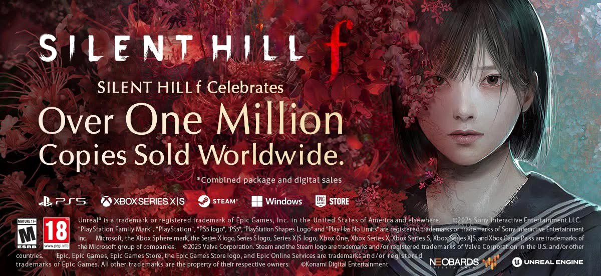 В компании заявили, что Silent Hill f достигла отметки в миллион проданных копий уже на второй день после выхода, но на самом деле это не совсем так. У Silent Hill f был ранний доступ, владельцы делюкс-издания начали играть 23 сентября.