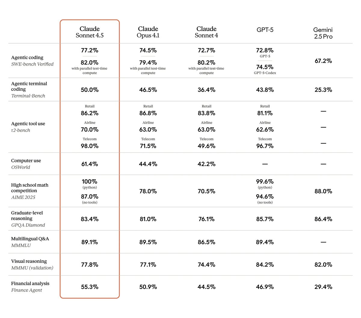 Кроме того, Claude Sonnet 4.5 заняла первое место в тестах SWE-Bench Verified с результатом в 77.2-82% в зависимости от способа запуска. Для сравнения: GPT-5 набрала 72.8% в этом бенчмарке.