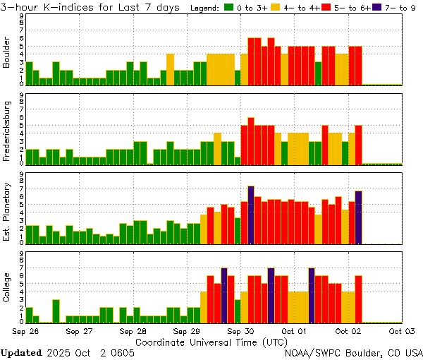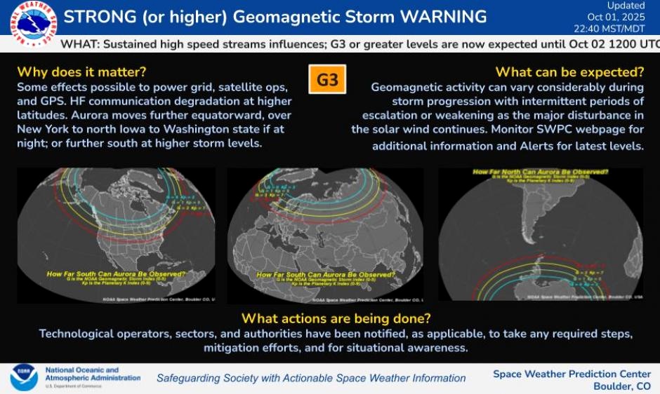 По состоянию на утро 2 октября сила магнитной бури варьируется от класса G1 до класса G3 в зависимости от региона. Сильнее всего магнитосфера возмущена в северных регионах планеты.