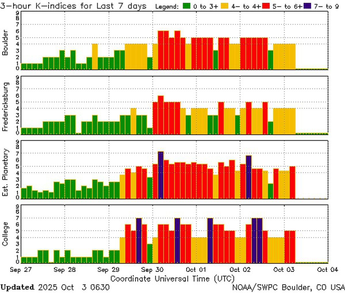 Предполагается, что всю вторую половину 3 октября индекс геомагнитной активности Kp будет на уровне 3.3-3.6 (магнитная буря начинается при 5 баллах). Ночью 4 октября ожидается усиление активности до 4.3, но затем магнитосфера постепенно начнет стабилизироваться.