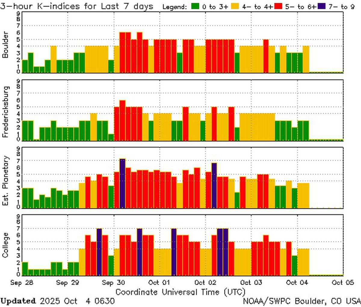 Магнитная буря, начавшаяся в конце сентября, все-таки закончилась. Вечером 3 октября давление на магнитосферу Земли начало спадать, по состоянию на утро 4 октября магнитосфера все еще возмущена, но уровень возмущения ниже уровня магнитной бури.