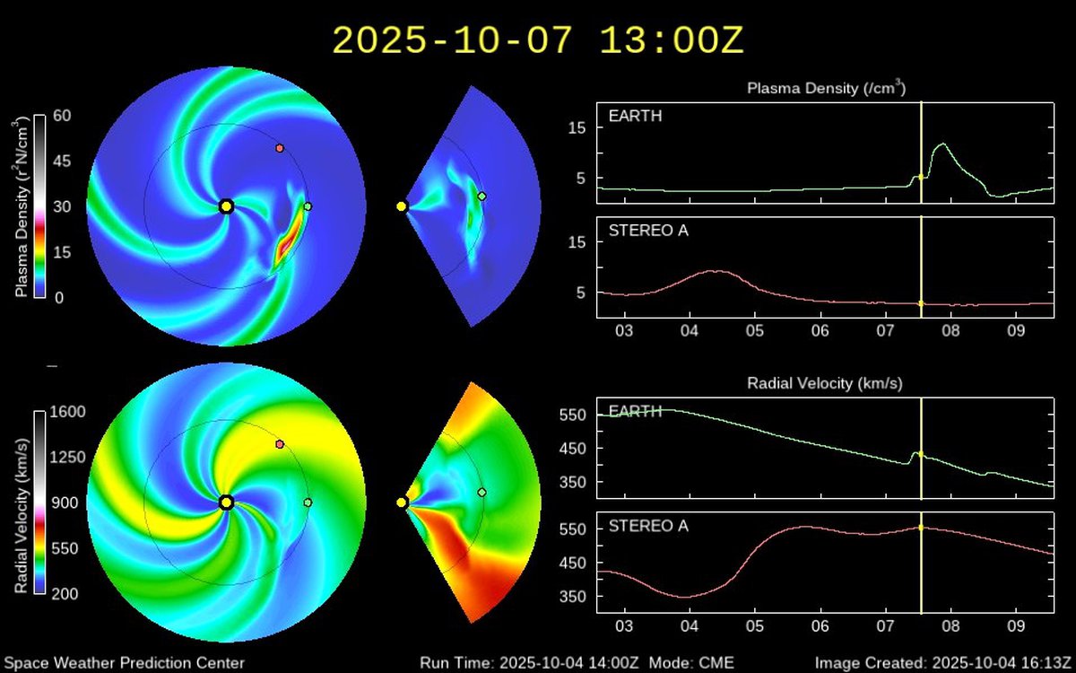 Согласно модели распространения солнечного ветра WSA-Enlil, 9 октября геомагнитная обстановка тоже может быть напряженной: на подходе еще один фронт частиц. Пока рано говорить о том, как он повлияет на Землю.