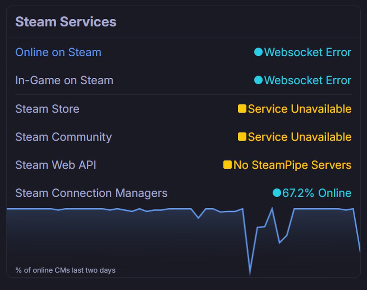 Судя по мониторингу Steam Status, проблема охватывает практически все службы Steam. Помимо самого магазина не работает Steam Community, с серверами Counter-Strike тоже есть проблемы.