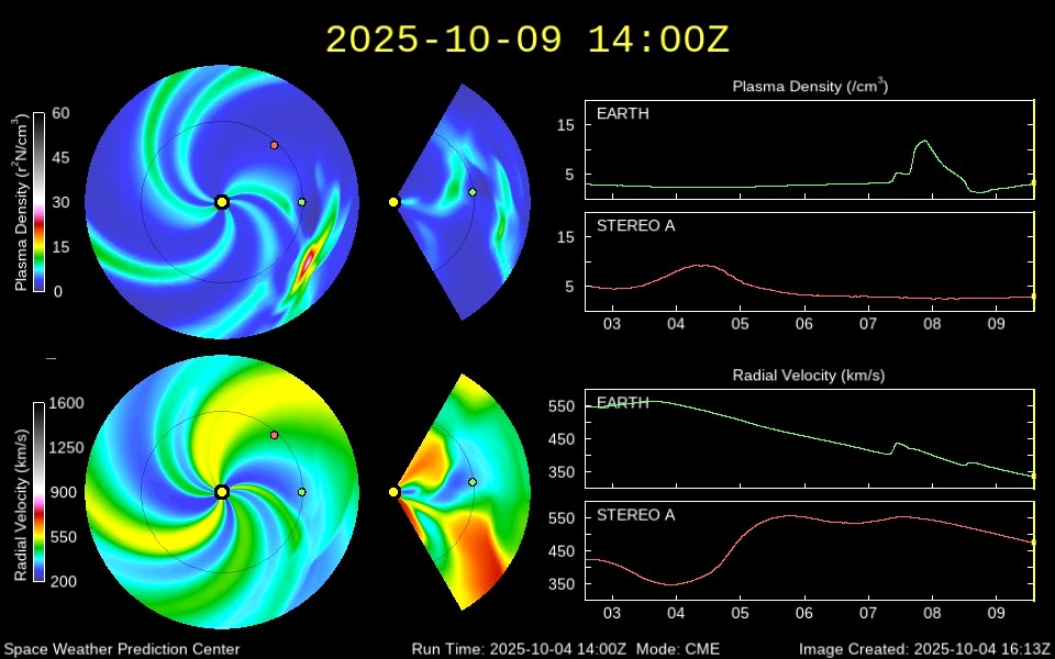 Судя по модели распространения солнечного ветра WSA-Enlil, ситуация может развиваться и иначе. Вполне возможно, что поток быстрой плазмы окажется обширнее ожиданий и вечером 9 октября мы снова увидим магнитную бурю.