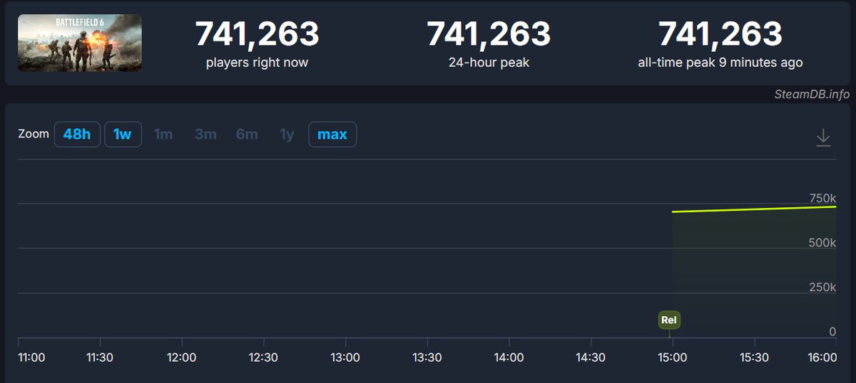 Релиз Battlefield 6 оказался крайне успешным как минимум с точки зрения количества игроков. Только в Steam онлайн Battlefield 6 уже превысил 741 тысячу человек и продолжает расти.
