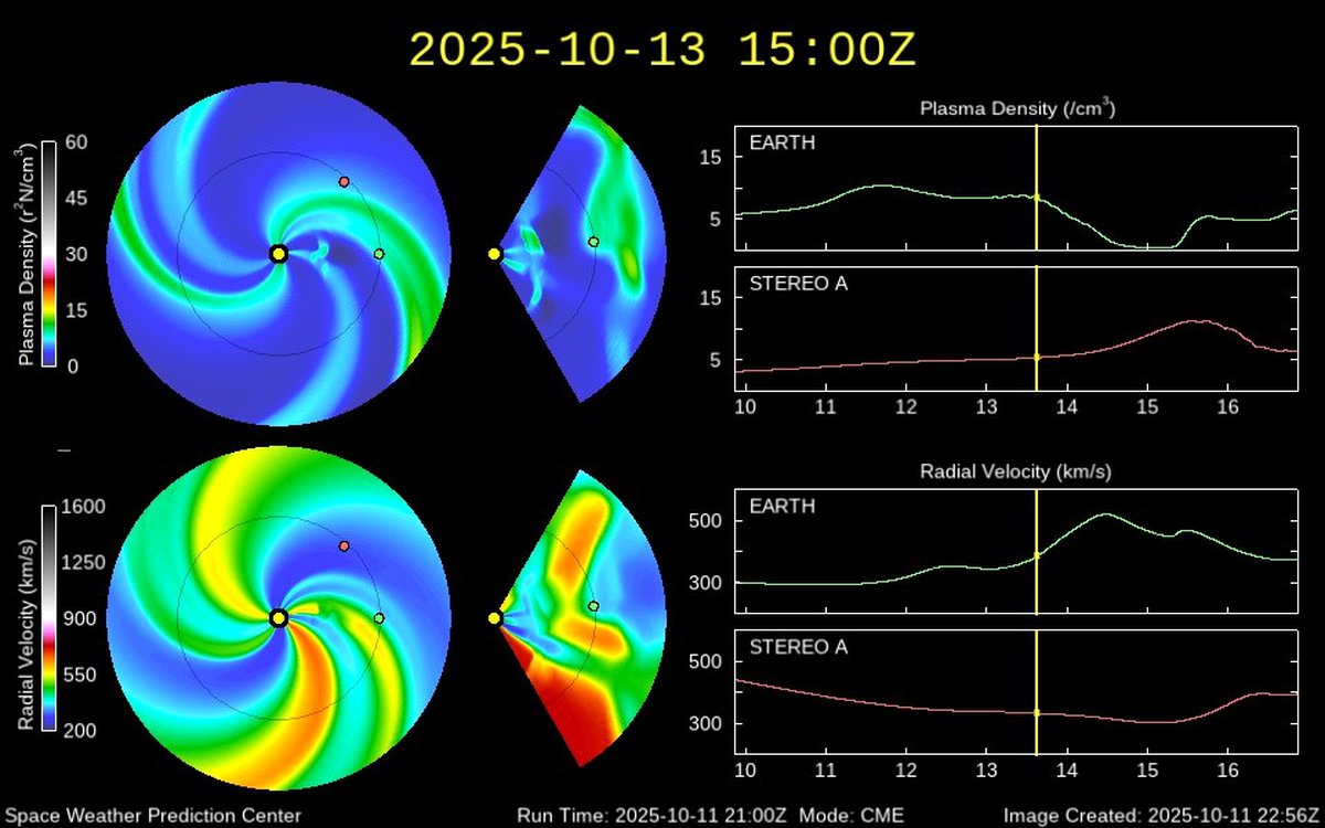 Согласно модели распространения солнечного ветра WSA-Enlil, 14 октября геомагнитная обстановка должна быть относительно спокойной, однако уже 15-16 октября Земля может снова войти в поток быстрого солнечного ветра. Возможно, в это время стоит ждать еще одну магнитную бурю.