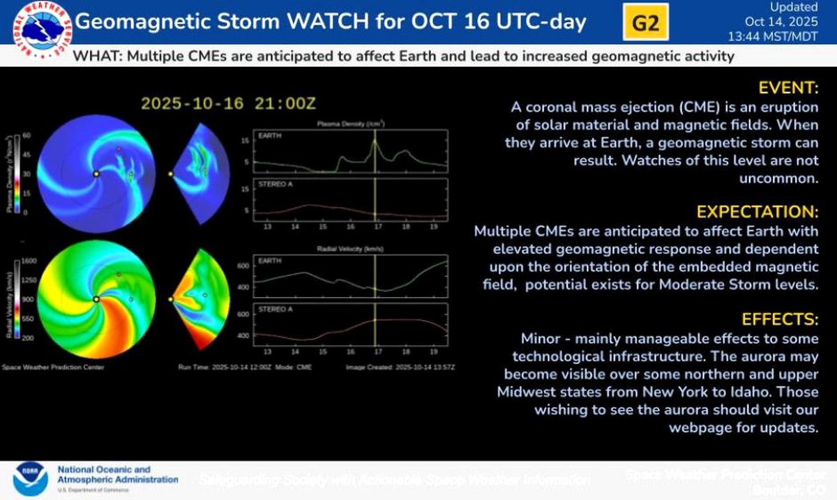 16 октября на Земле ожидается продолжительная магнитная буря, сообщают аналитики NOAA США и британского Met Office. Она будет длиннее и мощнее, чем ожидалось ранее.