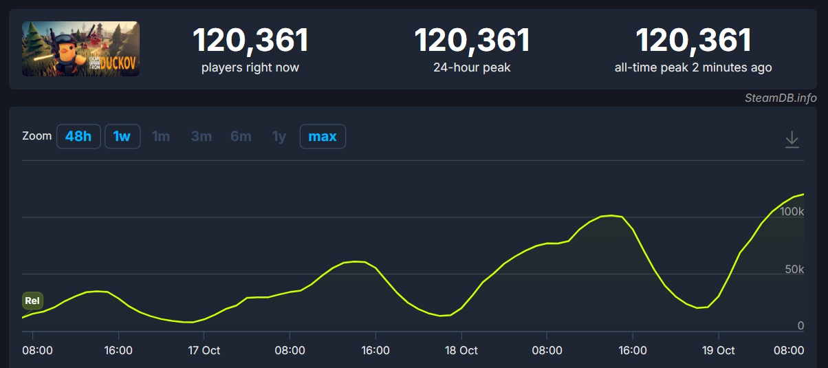 Другой интересный момент: в Escape from Duckov активно играет значительная часть аудитории. Вечером 18 октября онлайн в игре впервые превысил 100 тысяч человек, утром 19 октября онлайн уже превысил 120 тысяч человек.