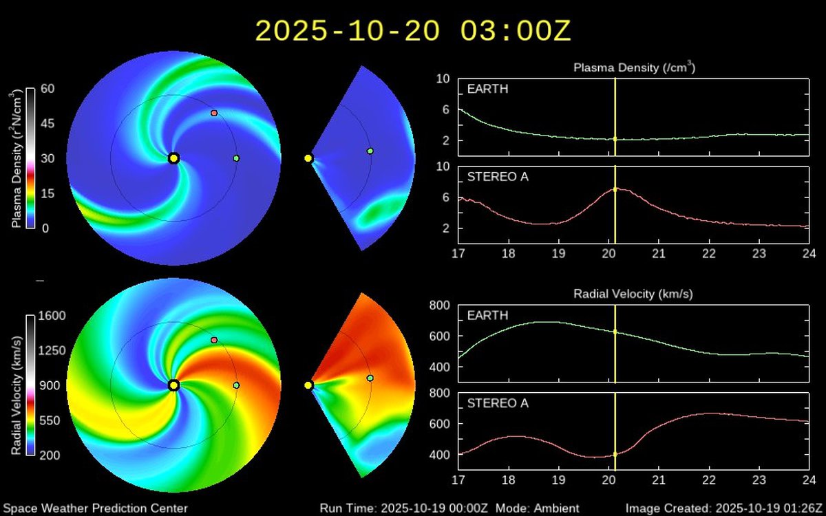 Ожидалось, что поток плазмы достигнет Земли в районе 21 октября, породив магнитную бурю класса G1. Согласно актуальной модели WSA-Enlil, эта угроза исчезла, и сейчас прибытие потока не ожидается: Земля окажется вне шлейфа частиц.