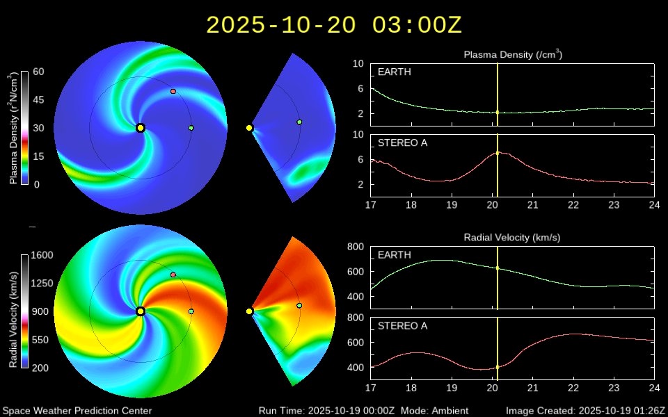 Ожидалось, что поток плазмы достигнет Земли в районе 21 октября, породив магнитную бурю класса G1. Согласно актуальной модели WSA-Enlil, эта угроза исчезла, и сейчас прибытие потока не ожидается: Земля окажется вне шлейфа частиц.