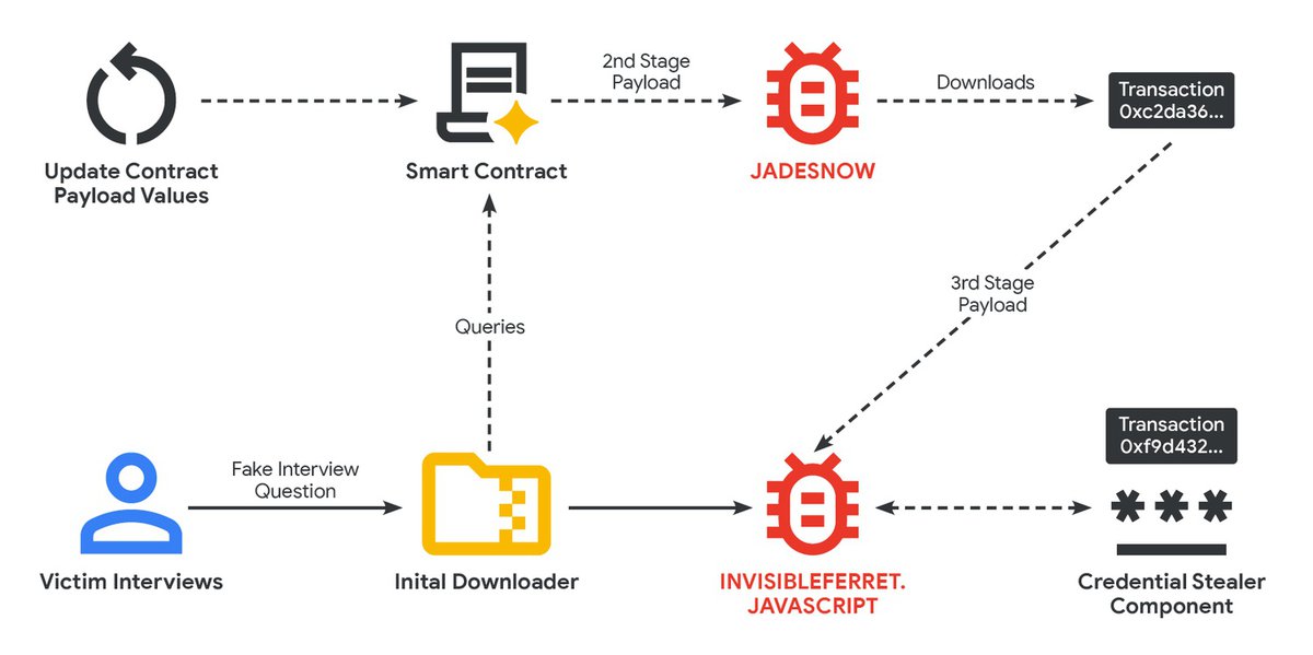 По данным исследователей, хакеры используют загрузчик JADESNOW на JavaScript, обращающийся к смарт-контрактам и получающий оттуда вредоносный код. Затем устанавливается шпионский модуль INVISIBLEFERRET.