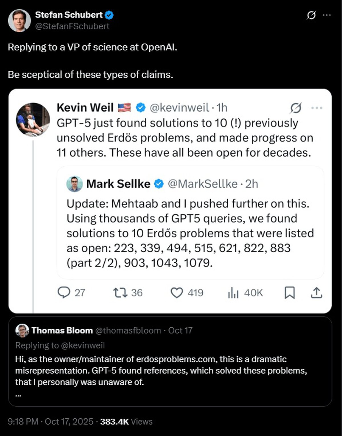 Как пояснил математик Томас Блум, слова Вайла были серьёзным искажением фактов. На самом деле GPT-5 лишь удалось обнаружить публикации, где эти задачи уже рассматривались и решались другими математиками.