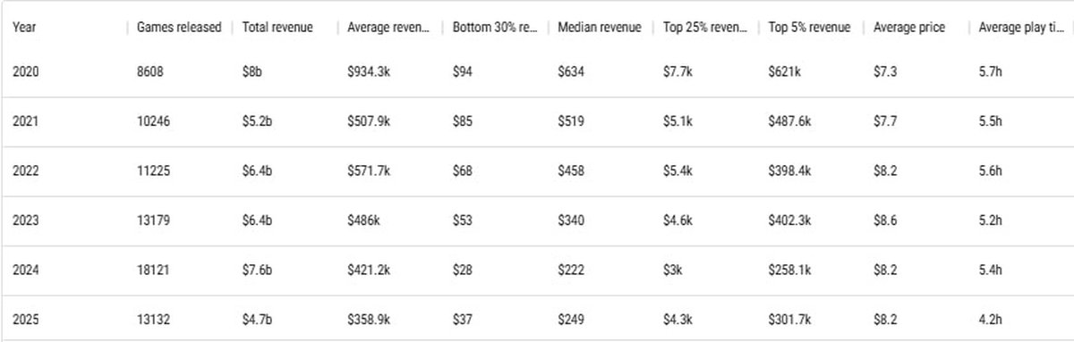 Согласно отчету, 66% из выпущенных в 2025 году игр заработали меньше $1000, а около 40% не смогли заработать даже $100. Именно такую сумму требуется заплатить Valve за публикацию игры в Steam.