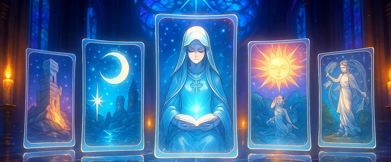 Дева: «Пятерка Мечей», «Верховная Жрица», «Король Пентаклей»