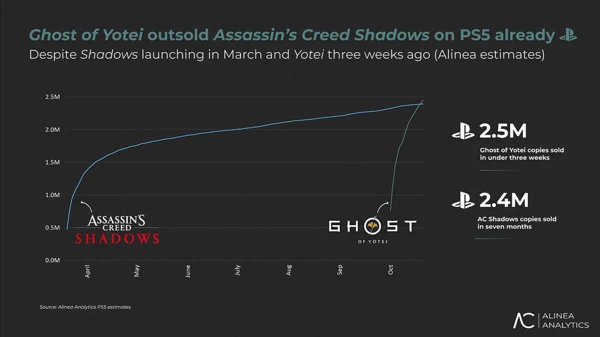 Продажи Ghost of Yotei на PlayStation 5 уже выше, чем у Assassin’s Creed Shadows, утверждает аналитическая компания Alinea Analytics. Тираж Ghost of Yotei оценивается в 2.5 миллиона копий.