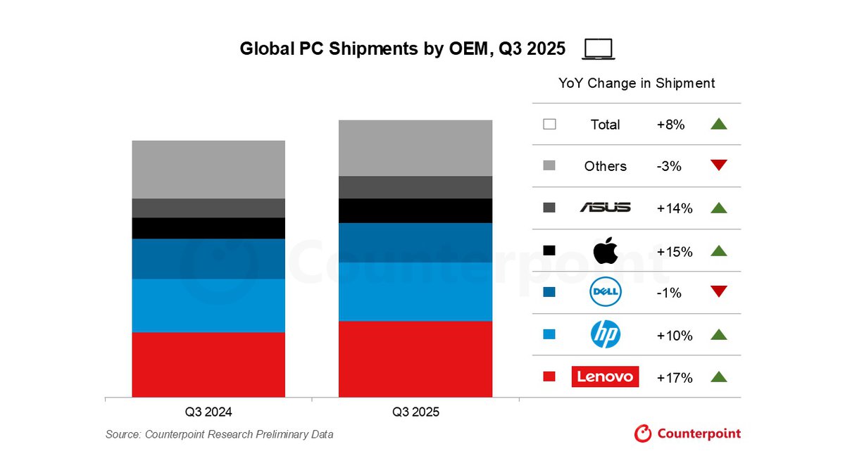 По данным аналитиков, совокупная доля пяти ведущих компаний (Lenovo, HP, Dell, Apple и ASUS) достигла почти 75% мирового рынка ПК, тогда как позиции остальных брендов остались без изменений или ослабли.
