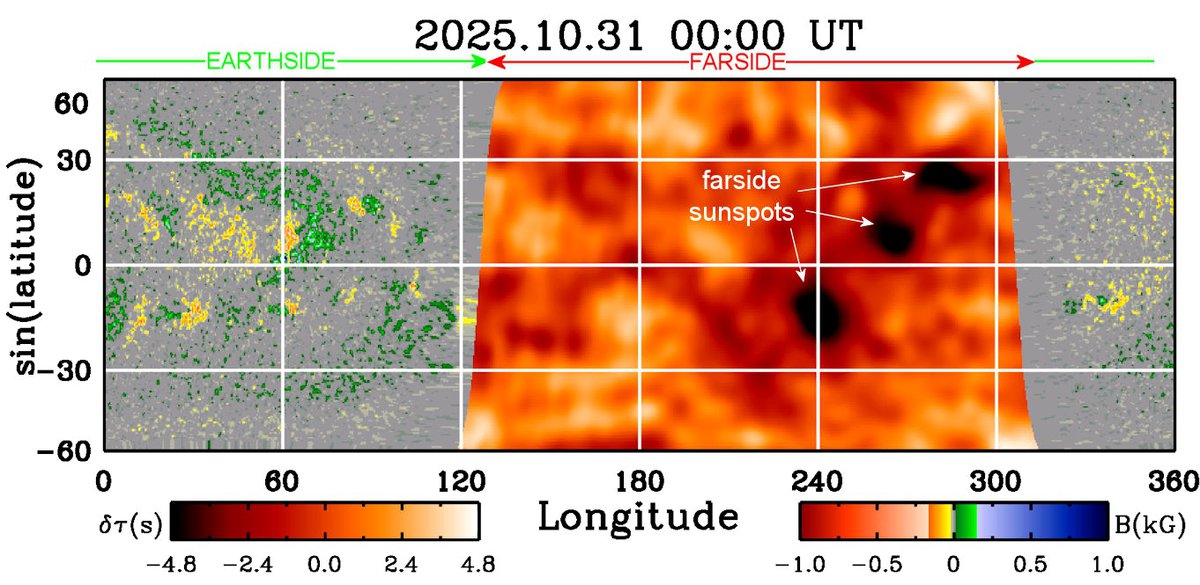 На обратной стороне Солнца фиксируются три крупных и активных группы пятен. Согласно гелиосейсмическим данным, уже через несколько дней эти пятна могут оказаться на видимой части звезды.