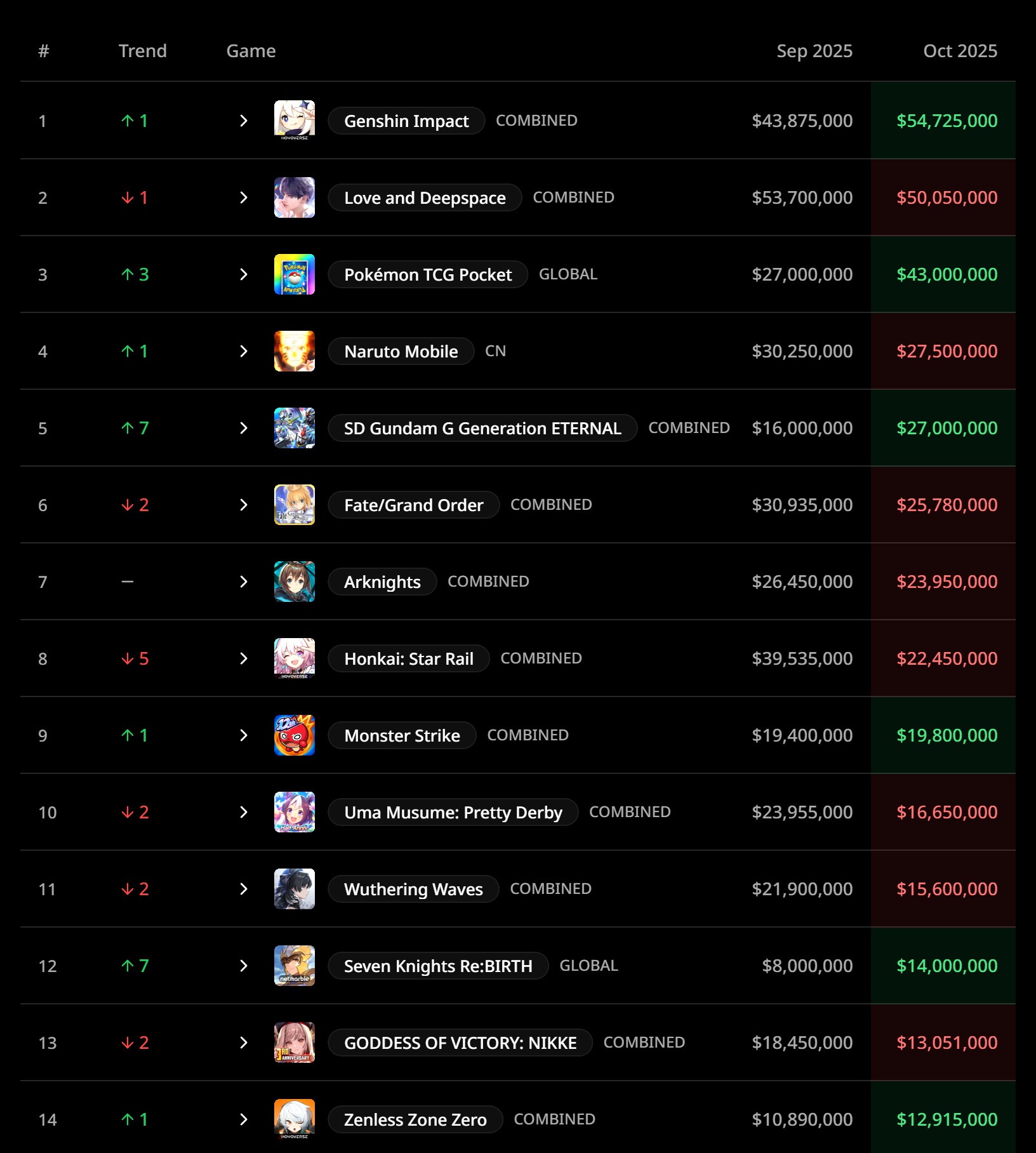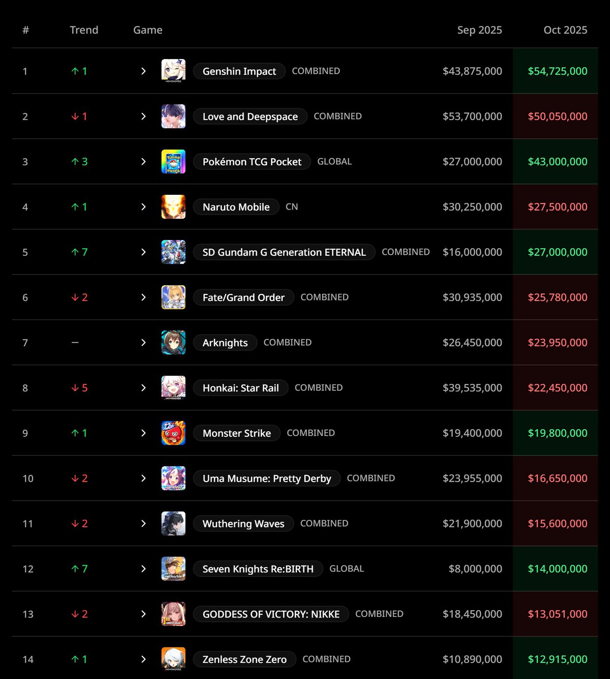 Доходы Genshin Impact оцениваются в $54.7 миллиона против $43.87 миллиона в сентябре; тогда игра занимала второе место в топе. По сравнению с августом это серьезный рост: тогда выручка была на уровне $26.72 миллиона.