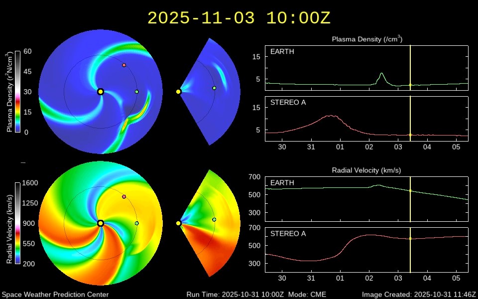 Полноценная геомагнитная буря 3 ноября не ожидается, однако в районе 9 утра по Москве индекс геомагнитной активности Kp поднимется выше 3.6 балла; буря начинается при 5 баллах. Затем активность магнитосферы немного снизится, но к ночи она снова пойдет в рост.