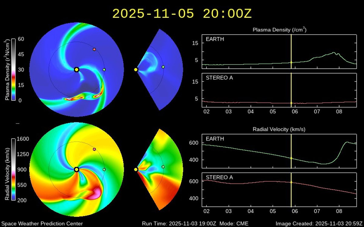 В районе 6-7 ноября до Земли доберется как первый из корональных выбросов массы от новых вспышек, так и поток частиц из довольно крупной корональной дыры на Солнце. Вероятно, потоки частиц усилят друг друга и мы увидим магнитную бурю как минимум класса G2.