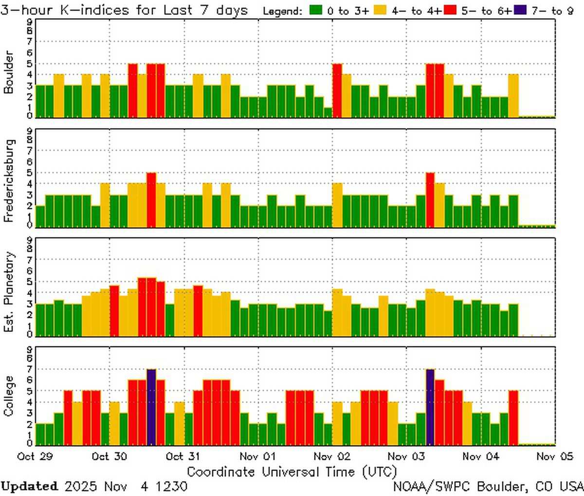 Если прогнозы все-таки верны, то 5 ноября станет днем затишья. Впервые за последние полторы недели индекс геомагнитной активности Kp стабильно опустится ниже 2 баллов и будет на таком уровне на протяжении всего дня.