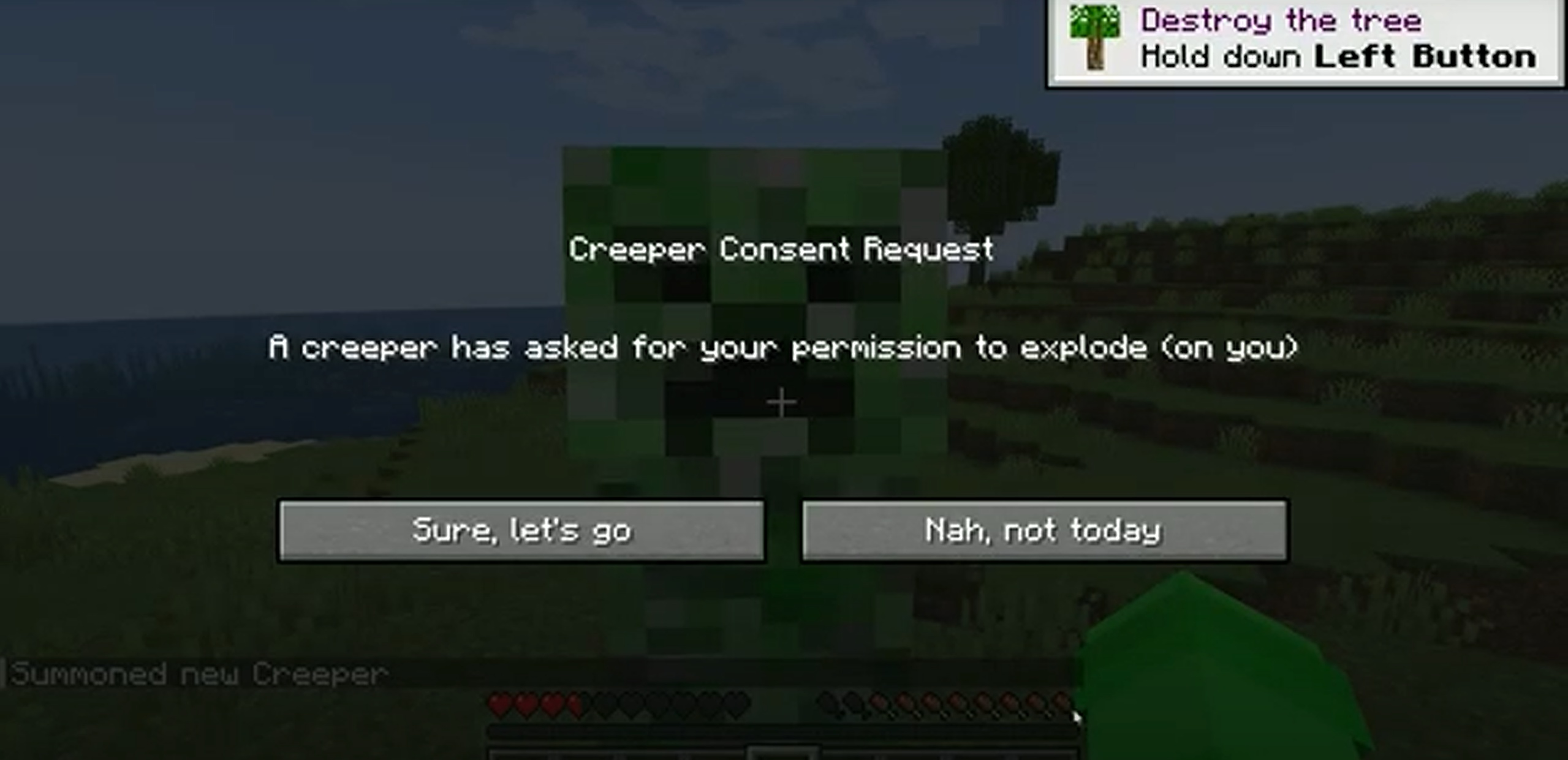 Модификация Creeper Consent делает криперов гораздо дружелюбнее. Теперь мобы не просто подбираются к игроку со спины, шипят и взрываются, разнося все окрестности, а сперва спрашивают разрешение.