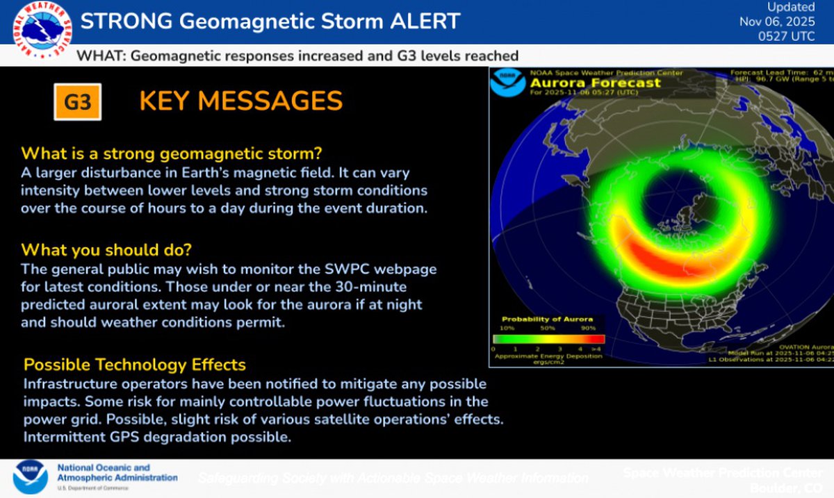 Аналитики NOAA США ожидают, что днем 6 ноября сила бури снизится до класса G2 или даже G1, но в ночь с 6 на 7 ноября магнитная буря вновь усилится до класса G3. Буря такой силы будет наблюдаться и днем 7 ноября.