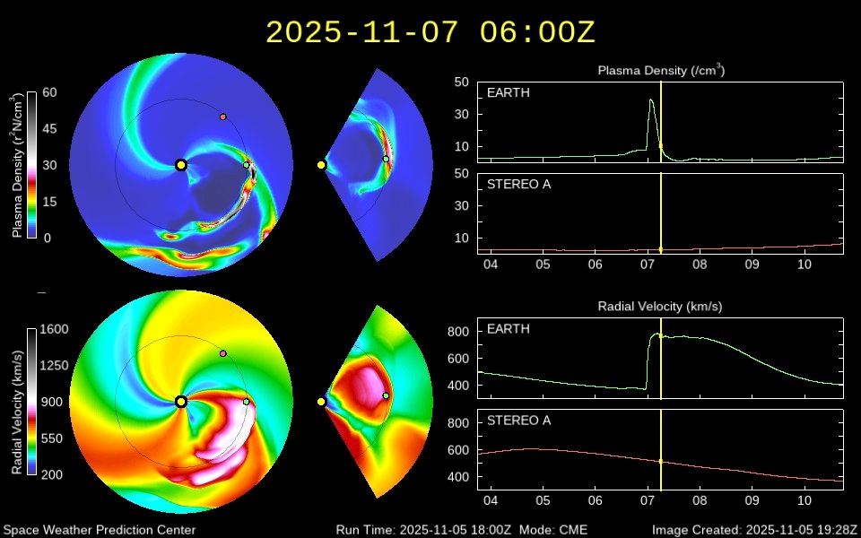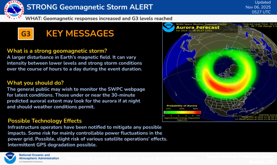 Аналитики NOAA США ожидают, что днем 6 ноября сила бури снизится до класса G2 или даже G1, но в ночь с 6 на 7 ноября магнитная буря вновь усилится до класса G3. Буря такой силы будет наблюдаться и днем 7 ноября.