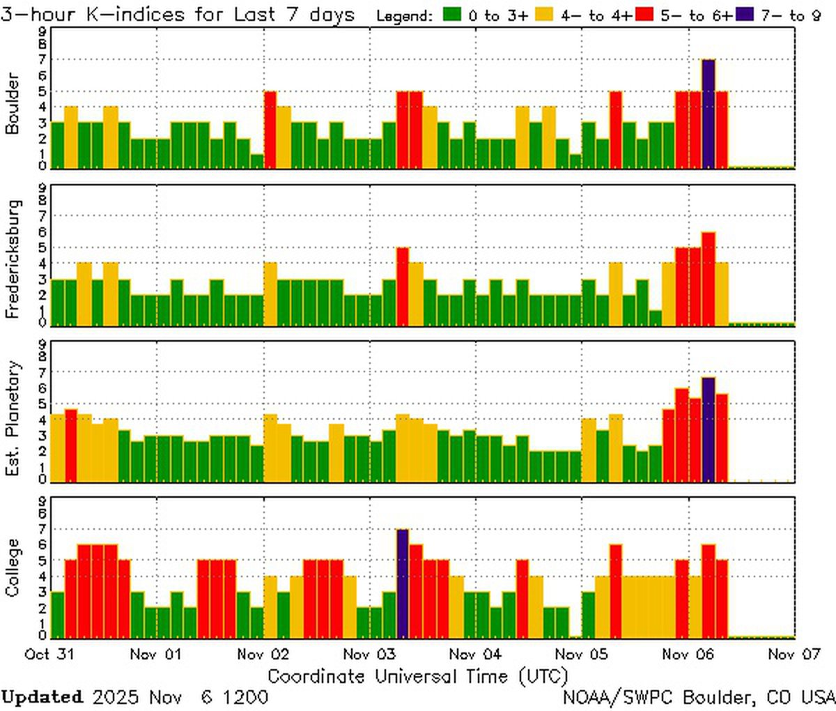 Если верить прогнозам NOAA США и британского Met Office, магнитная буря, начавшаяся 6 ноября, будет идти до самого вечера 7 ноября. К сожалению, 7 ноября магнитная буря даже усилится.