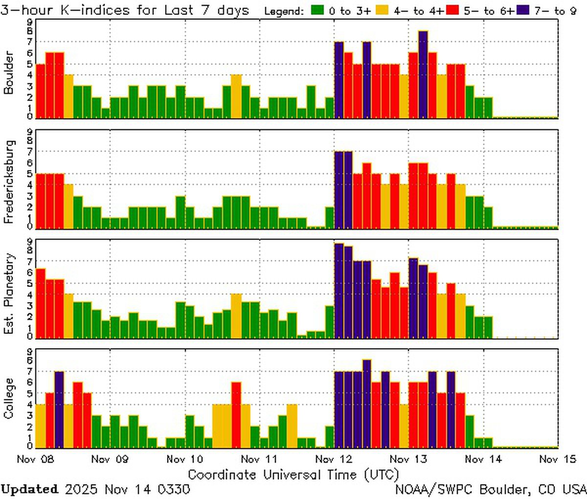Магнитная буря 12-13 ноября оказалась самой сильной в 2025 году. Сила шторма достигла класса G4 и в некоторых регионах подбиралась к максимальному классу G5, такие уровни возмущения в прошлый раз наблюдались в 2024 году.