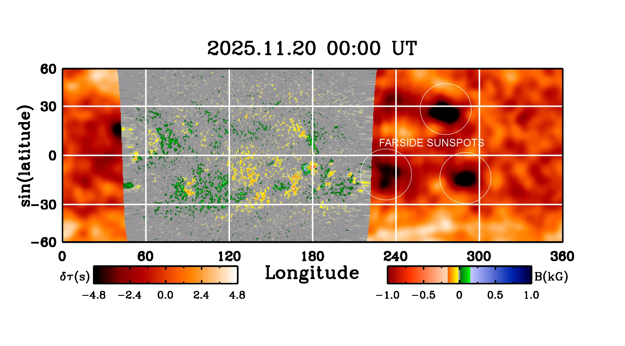 Гелиосейсмические данные указывают, что на невидимой части Солнца есть как минимум три источника вспышек. Это три крупных группы солнечных пятен, отличающихся высокой нестабильностью магнитных полей.