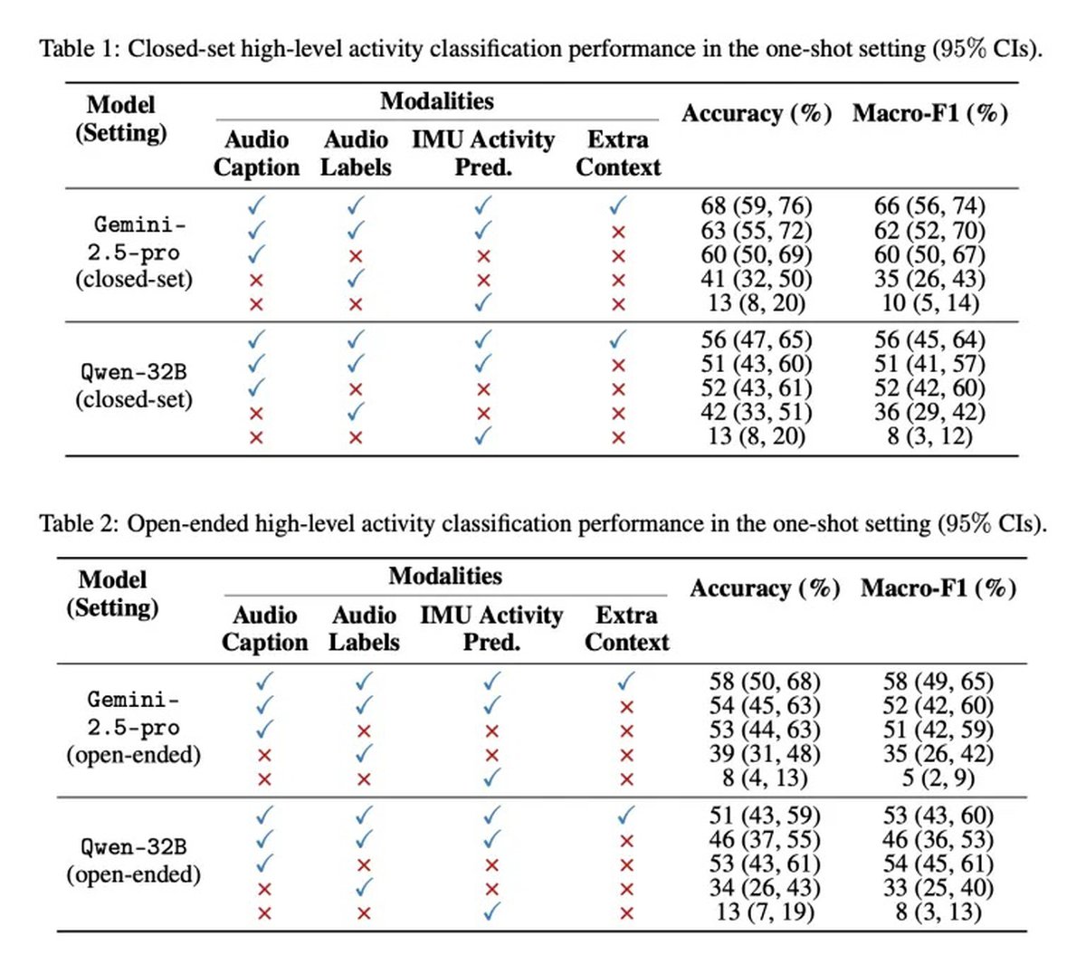 Оказалось, даже без специального дообучения большие языковые модели смогли определять деятельность людей с ненулевой точностью. При добавлении одного примера каждой активности результаты моделей стали еще лучше.